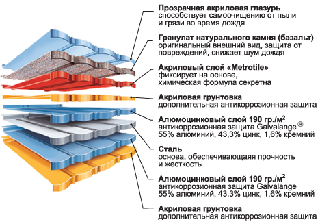 - композитная металлочерепица с посыпкой MetroTile представляет собой многослойное кровельное покрытие, основу которого составляет стальной лист толщиной 0,5 мм;