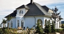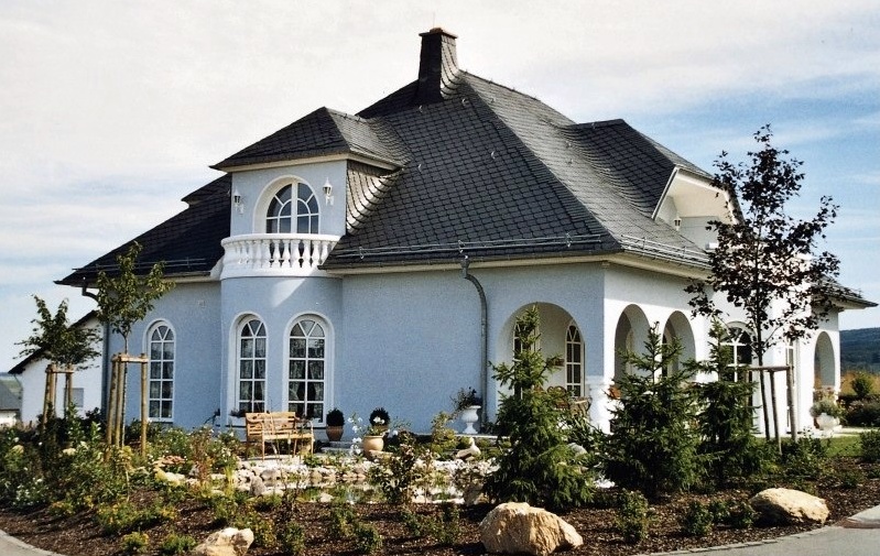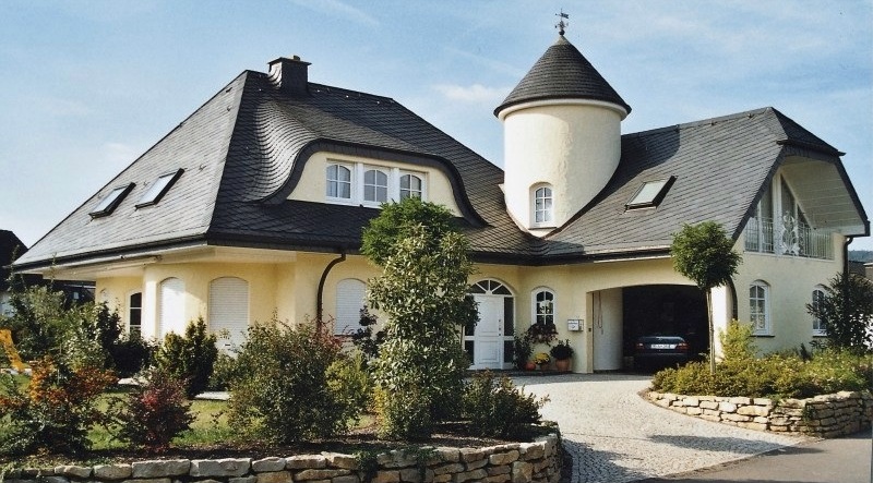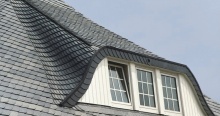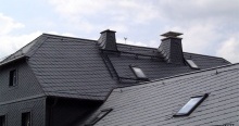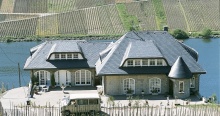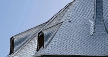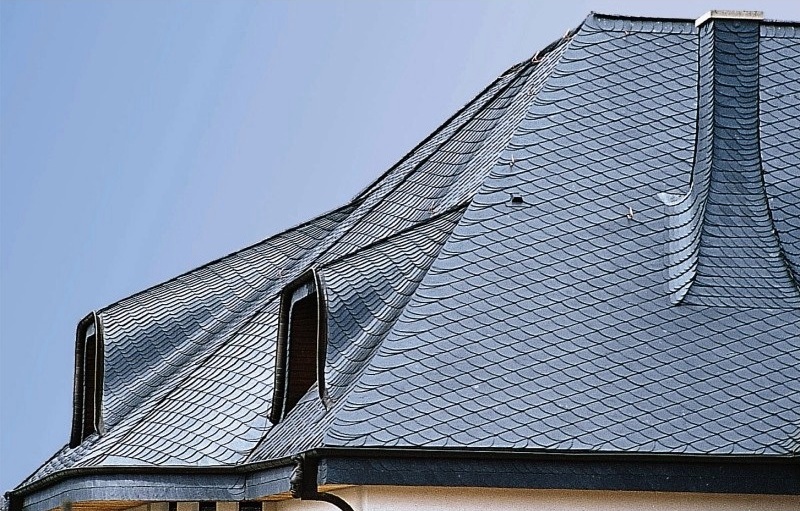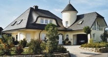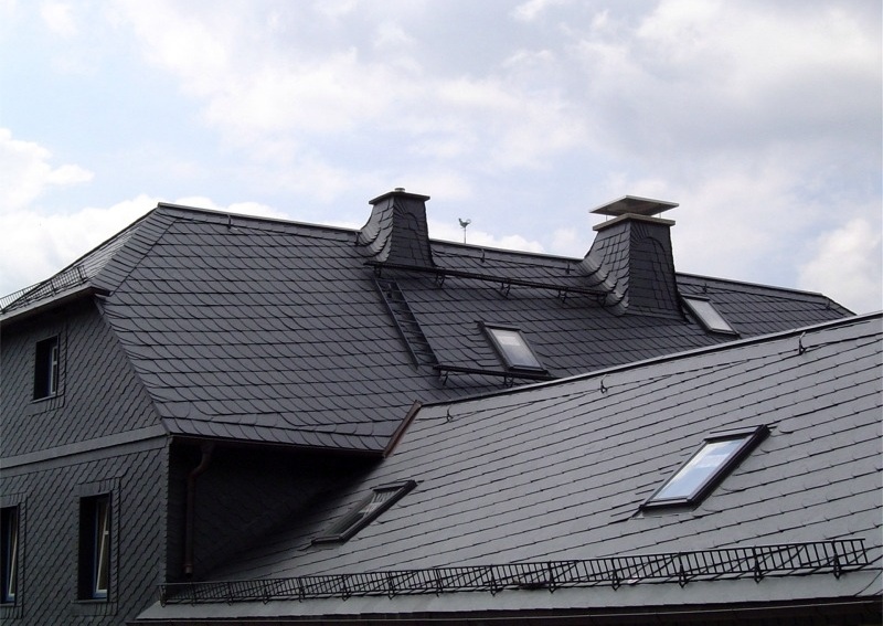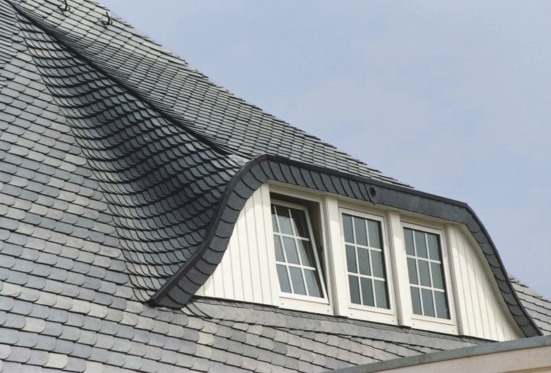Укладка кровельными плитками "Bogenschnitt" (с округлённым краем) и "Waben" (соты) относятся к наиболее выгодным способам иметь все преимущества кровли природным сланцем, экономя при этом денежные средства при покупке материала. Производственное изготовление плитки с использованием современной техники позволяет снизить цены до минимума. Кроме того, для укладки 1 кв.м. поверхности необходимо довольно малое количеством кровельных плиток. Материал: В качестве кровельного материала используется природный сланец марки "Ассуло" (Assulo®) и "Монтеколор" (Monte Color®). По желанию заказчика возможно также изготовление материала из природного сланца марки "Альтлайер" (Original Altlayer®).