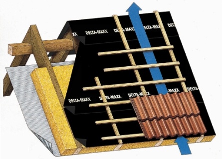 | Свойства Основой является слой из полиэфирного материала с высокой прочностью на разрыв (350 N/5 см), поверх которого нанесено паропроницаемое (Sd=0,15 м) покрытие из полиуретана. Двухслойная плёнка DELTA®-MAXX предназначена для использования в крышах со сплошным настилом (опалубкой) или без настила. Она надёжно предохраняет утеплитель и стропильную конструкцию от увлажнения конденсатом в моменты его экстремального образования, когда при проведении в зимний период внутренних отделочных работ, изготовлении цементных стяжек пола и оштукатуривании стен выделяются десятки и сотни литров парообразной влаги. Даже при условии правильного исполнения вентиляции, гидро- и пароизоляции другими плёнками возможно увлажнение конструкций в момент оттепели. Но DELTA®-MAXX благодаря специальному адсорбционному слою способно удерживать и после испарять за счёт диффузии до 1000 г/м2 конденсационной влаги.